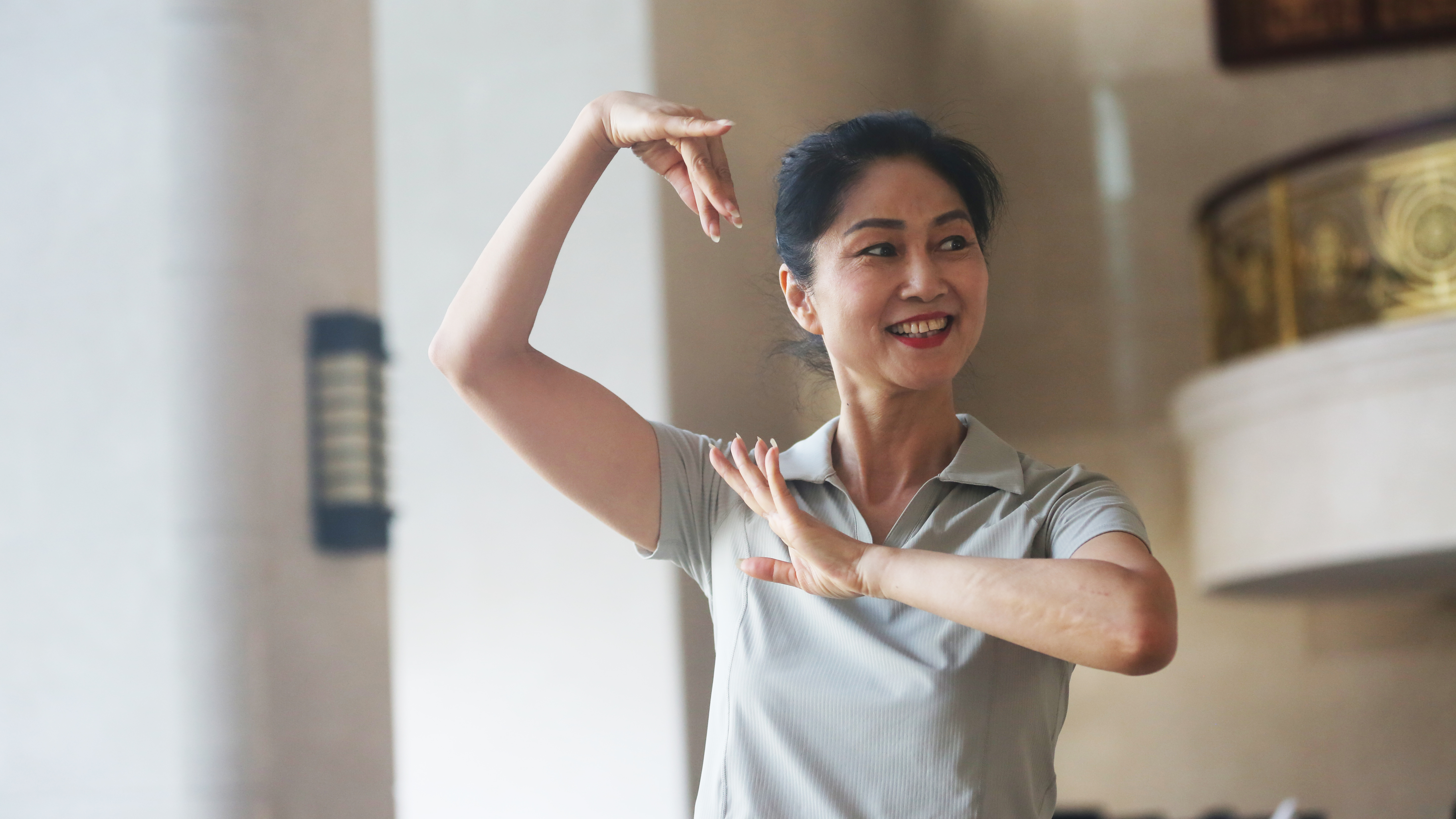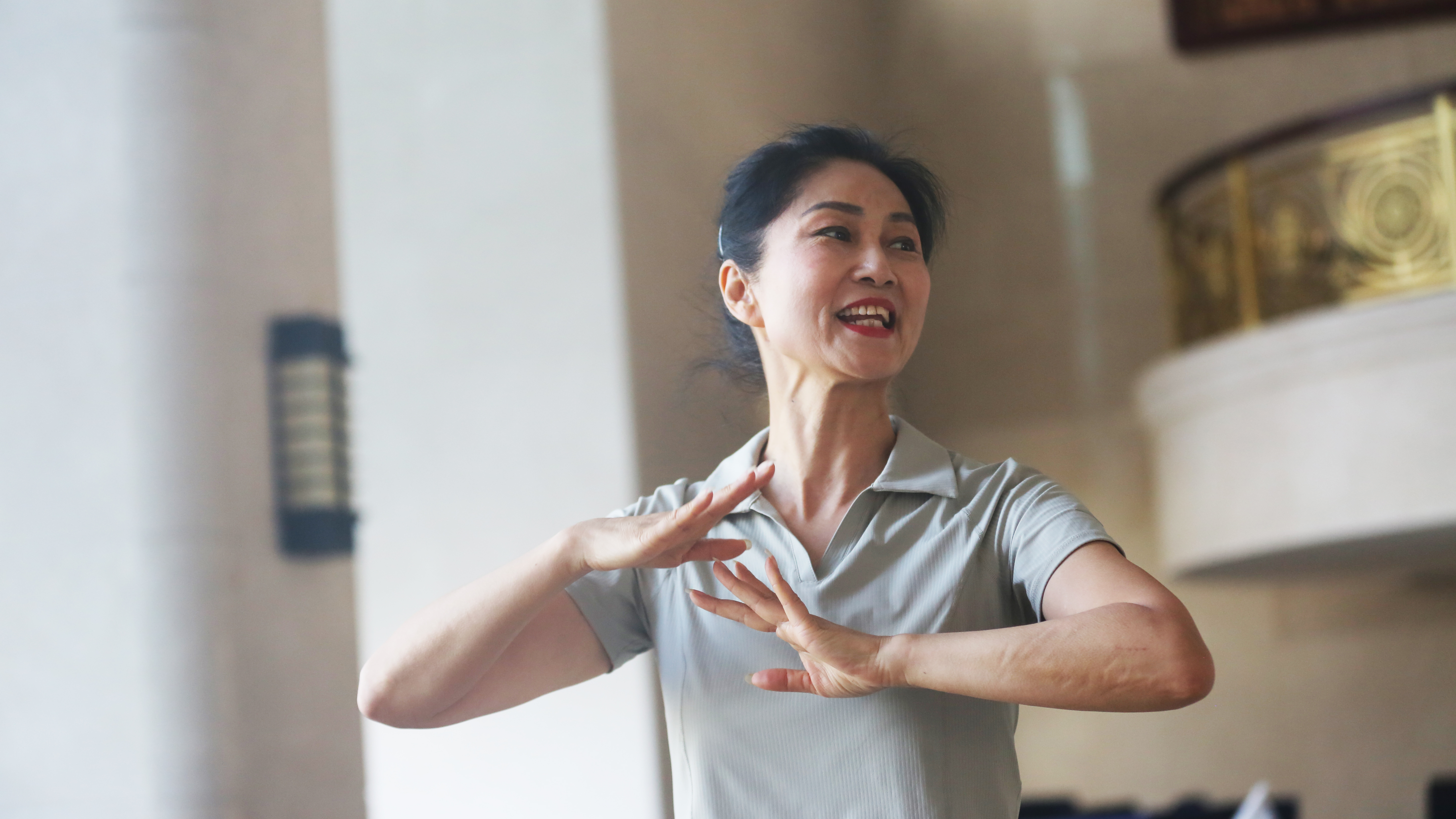 新疆维吾尔自治区老年人体育协会代表队队员梁炳芝展示舞蹈动作